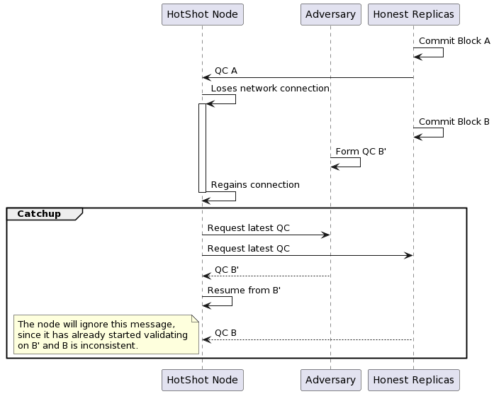 The adversary does this by taking advantage of an ambiguity which honest nodes must somehow resolve when they are joining the network for the first time or catching up after being offline for some time. In order to catch up, such nodes will look for signed QCs attesting to HotShot state changes, so they can figure out which state to sync with. Since they cannot tell the difference between honest peers and adversaries, and adversary who can provide QCs from the malicious fork faster than honest peers can provide QCs from the canonical fork can convince honest nodes in catchup to sync to the malicious fork. Over time, the adversary may convince enough honest nodes to switch that the malicious fork becomes the "canonical" one, and blocks which were committed in the old canonical fork are permanently lost.