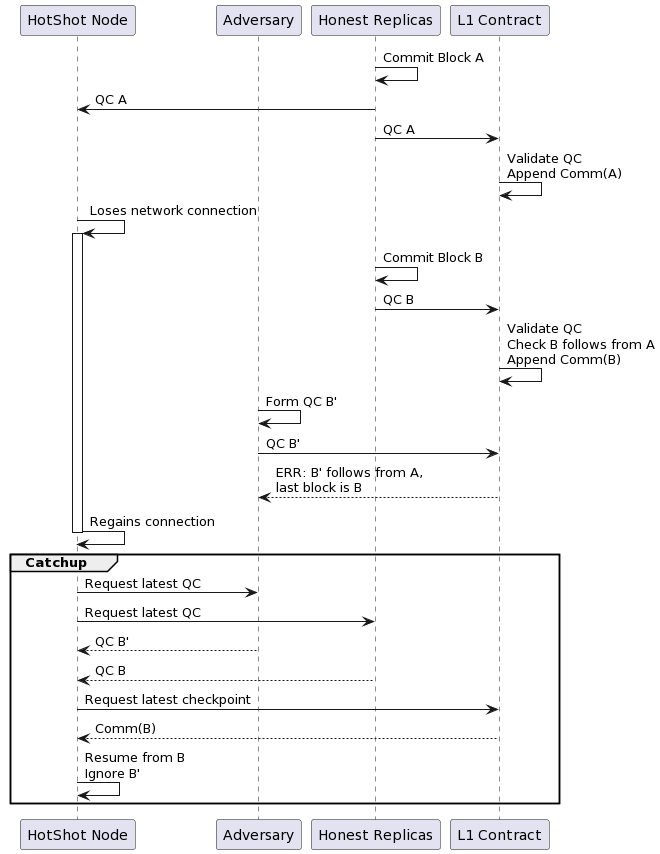 Nevertheless, we can consider what happens in the extremely unlikely event that HotShot does suffer a safety violation, and some block which was considered final according to the HotShot protocol is removed from the history of the ledger. In this case, we can maintain finality by using the HotShot checkpoints on L1 to decide on an immutable, canonical chain.