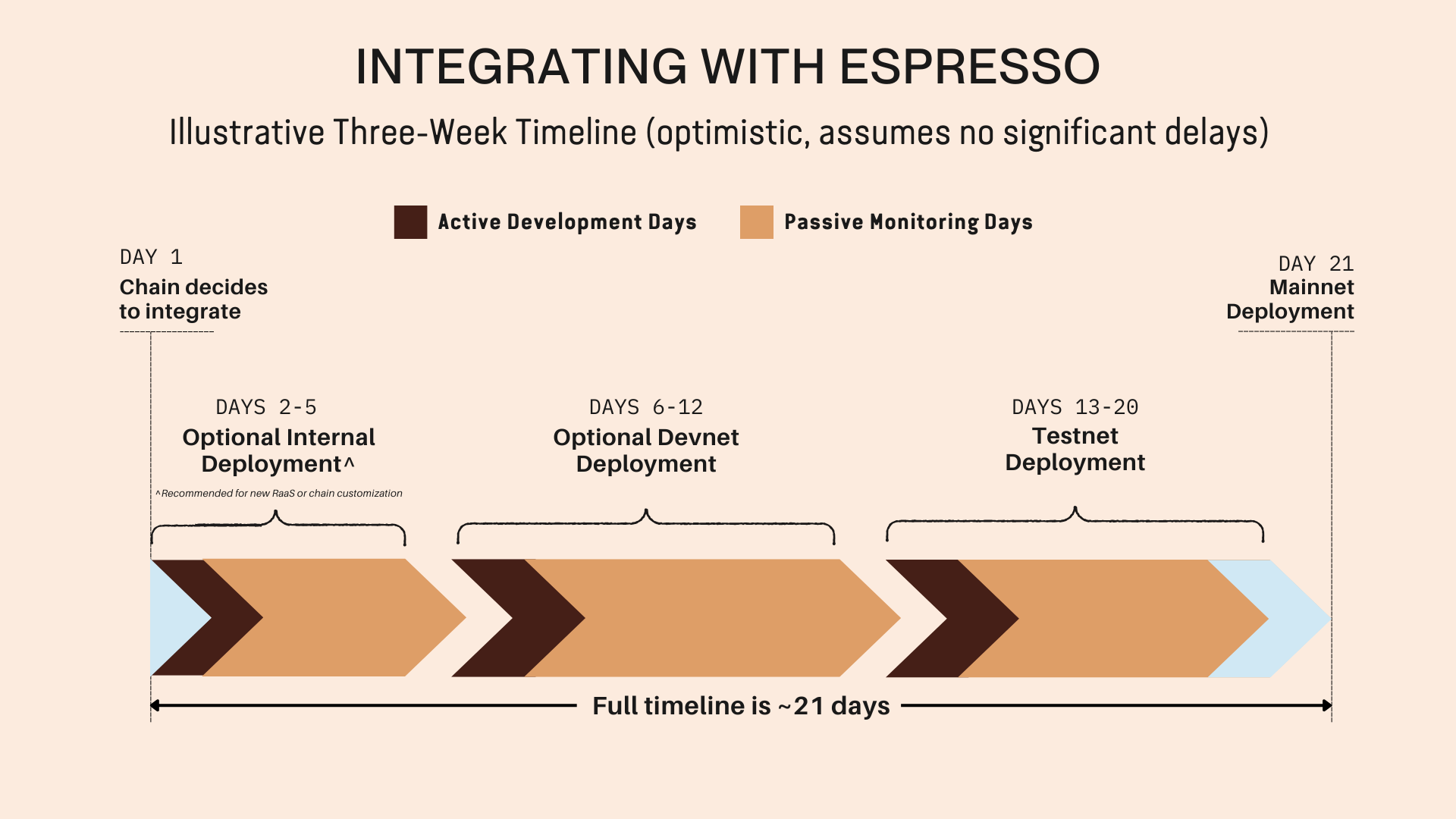 * A devnet deployment (3-7 days) is optional but is recommended for new architecture or a RaaS provider that has not previously integrated with Espresso.