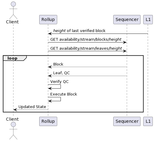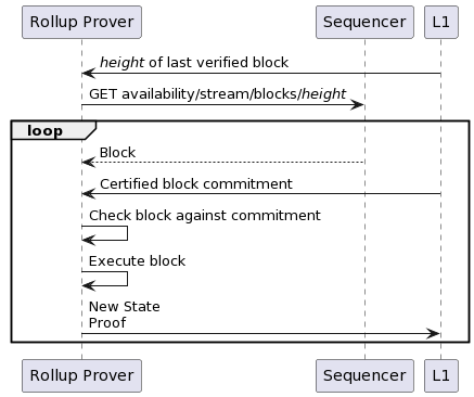Rollup nodes may use these APIs differently depending on the role they are playing in the system (e.g., prover, full node, etc.). A prover can use the API to stream block data from a node, so that it can execute blocks as they are finalized and generate proofs. The prover also interacts with the L1, since it can only verify a rollup proof on the L1 if the L1 has already verified the sequencing of the corresponding block.