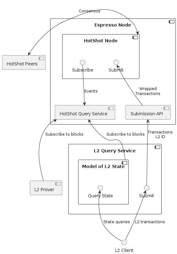 An Espresso node is a participant in the HotShot consensus protocol which also makes available some services to support L2 clients. The Espresso node is L2 agnostic: it does not provide services specifically tailored to any particular L2. It merely exposes all available information about HotShot and the log of blocks which have been sequenced. Any L2 may query this information and interpret the blocks according to its own execution rules in order to implement a prover, executor, RPC service, etc.