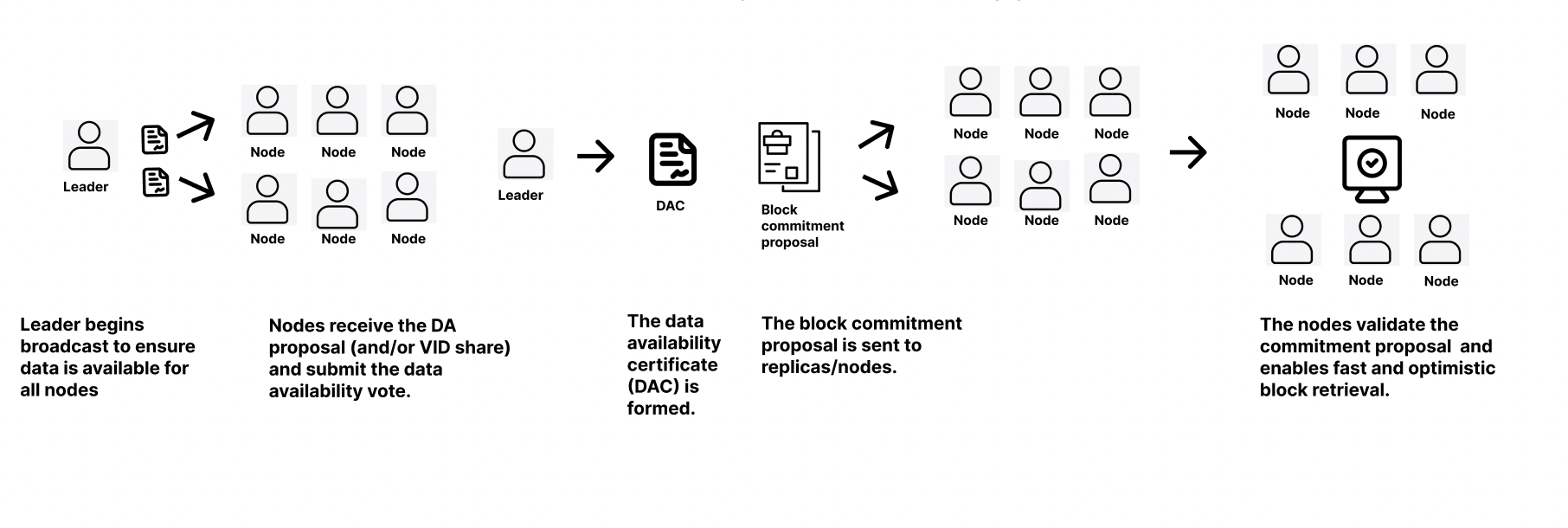 **Step 4:** The block commitment proposal is sent to replicas/nodes. The block commitment is a a cryptographic proof that a block is valid and has guaranteed DA.