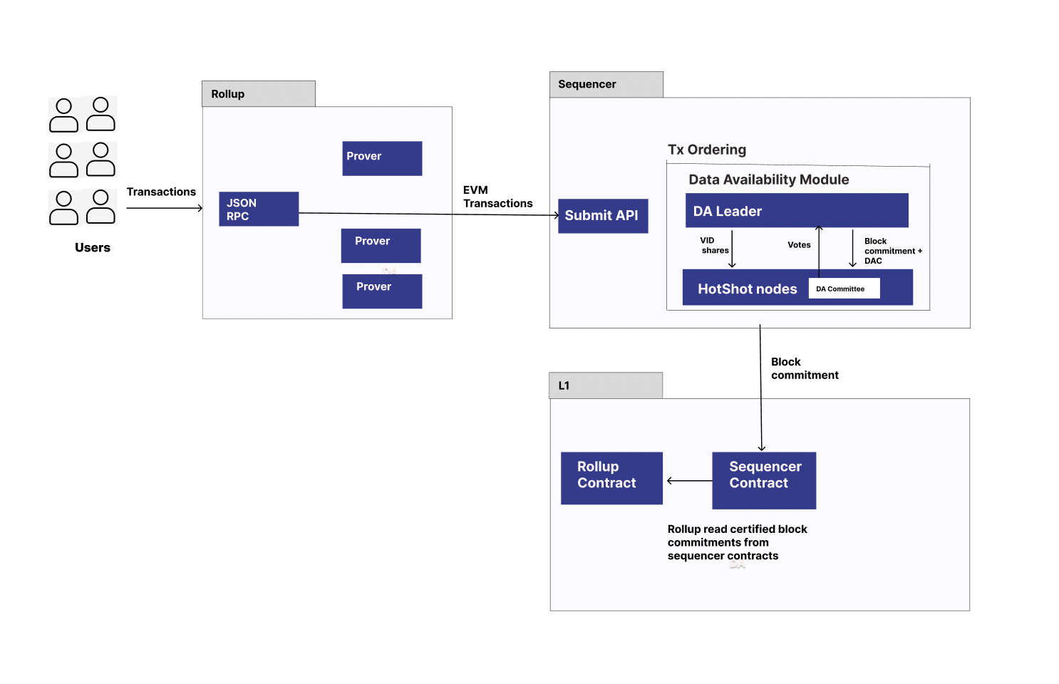 The data availability process initiates with sequencers submitting blocks to HotShot. Each view[^1], a leader is selected within [HotShot](https://github.com/EspressoSystems/HotShot/blob/main/docs/HotShotDocs/main.md) who bundles these blocks into a single block within HotShot. Rather than sending the full block data to other HotShot nodes, the leader only sends a commitment to the block for other nodes to vote on. All HotShot nodes also participate as storage nodes in the VID protocol and receive a small chunk representing their VID share of the respective block. The [DA leader](#user-content-fn-2)[^2] sends a [DA proposal](#user-content-fn-3)[^3] to the randomly sampled DA committee and all HotShot nodes. After receiving enough votes from the DA committee and the nodes in the network, the DA leader constructs a data availability certificate (DAC).
