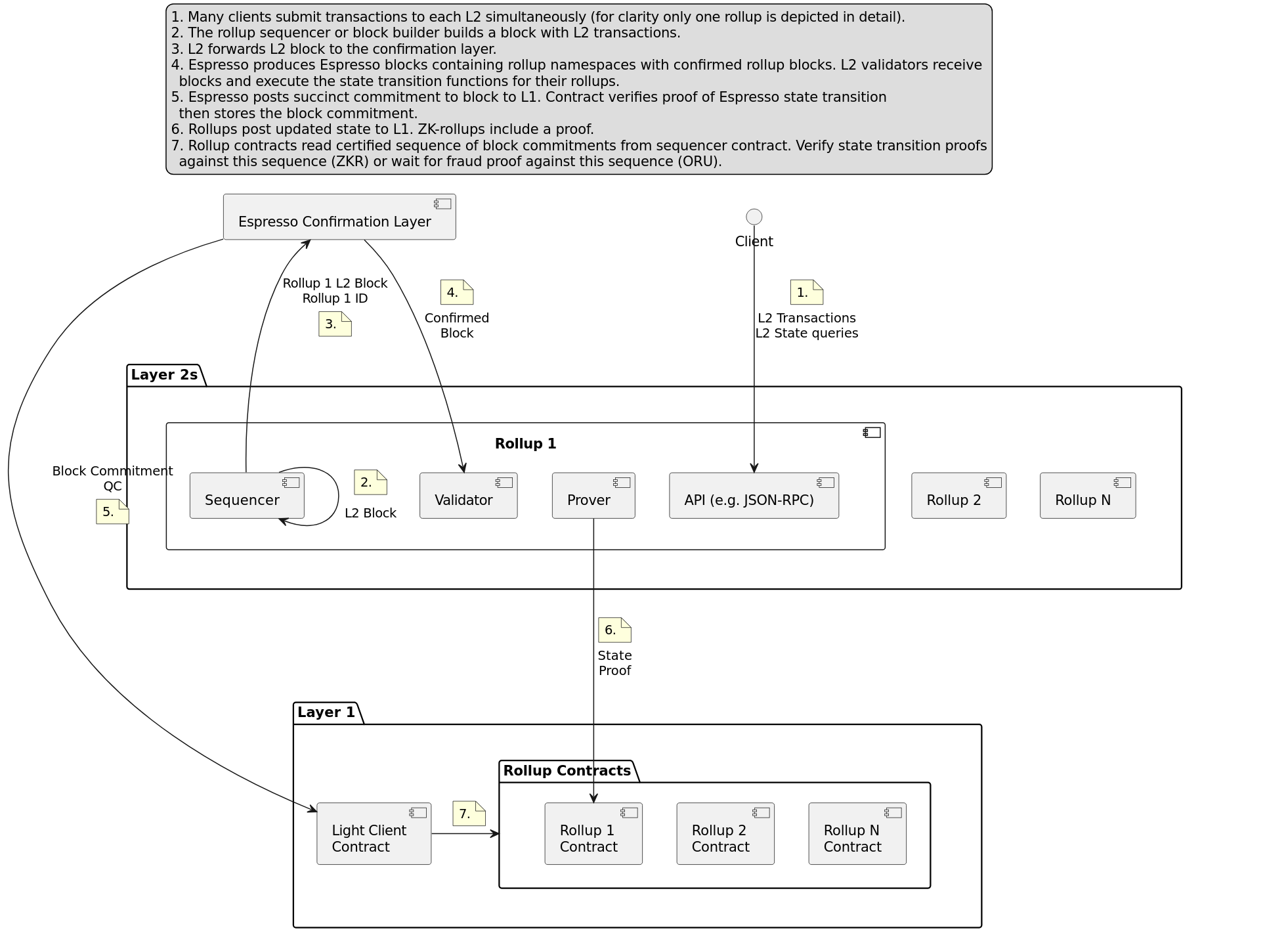 * **The L2 (layer 2) chains:** These are the chains that use Espresso for fast confirmation. They could be anything from app-specific chains to fully-featured smart contract systems in their own right (like EVM rollups). Each chain is assumed here to be structured as a rollup: after receiving an ordered sequence of transactions, the transactions are executed off-chain in some deterministic VM, and periodically state updates are posted to the layer-1, along with a proof of validity (for ZK-rollups) or a potential fraud proof (for optimistic rollups).
